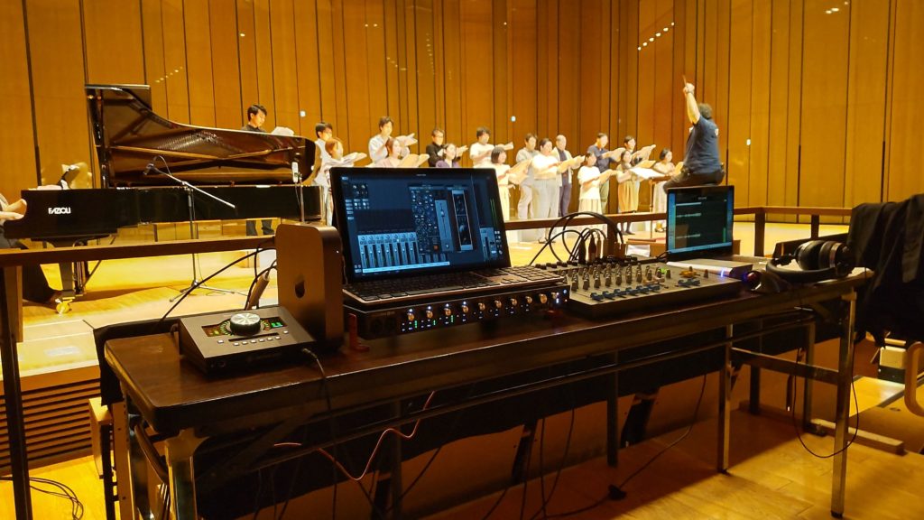 ソロの楽器や声を拾うのではなく、全体の響きと各パートが濁らないように収録するのに気を使います。今回はホールの三点式マイクがDPA社のいいものがあったので使わさせていただきました。